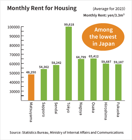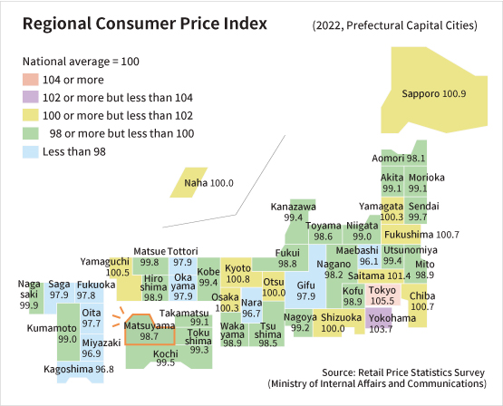 Ehime Prefecture has a low cost of living compared to the national average, making it a comfortable place to live. The regional consumer price index, with the national average set at 100, is 98.7 in Matsuyama city, ranking it third-lowest in the Chugoku and Shikoku regions.