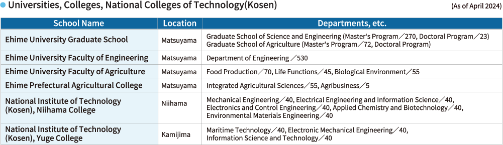 Ehime Prefecture is also known as an education-focused region, nurturing many outstanding talents who will lead the next generation within its comfortable educational environment.For companies considering establishing new bases, Ehime Prefecture and its municipalities will work together wholeheartedly to support resolving any concerns regarding securing talent.