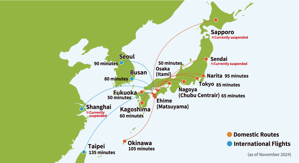 It also operates international scheduled flights to Shanghai, Seoul, Busan, and Taipei. The airport continues to pursue the establishment of additional international scheduled routes to neighboring Asian countries.