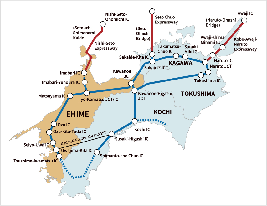 The extension of the Shikoku Vertical and Horizontal Expressways and the development of the Honshu-Shikoku Bridge Network, including the Nishiseto Expressway (Shimanami Kaido), have significantly reduced travel times. From Matsuyama city, it takes approximately 2 hours to reach the capitals of each Shikoku prefecture, and travel times to major cities in the Kansai and Chugoku regions have also been significantly shortened.