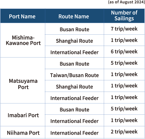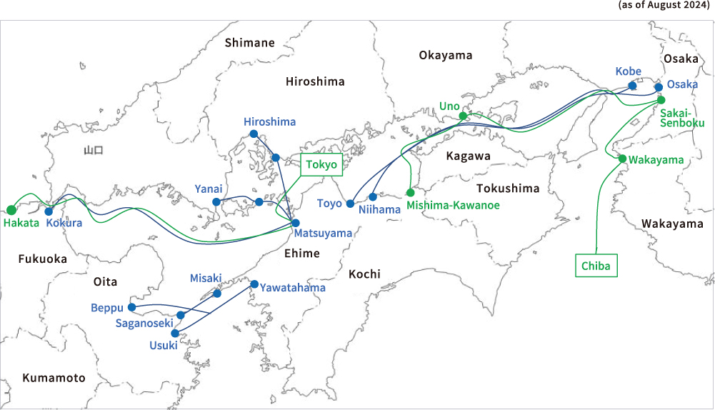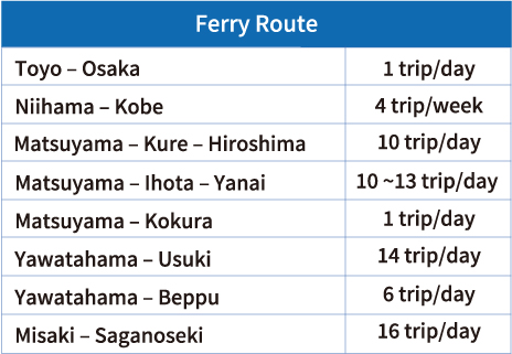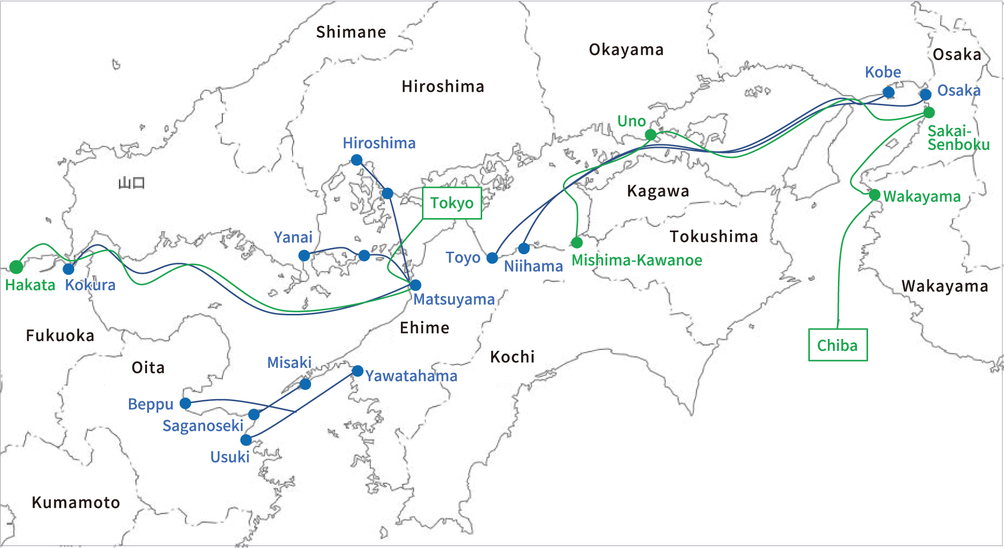 Numerous ports are developed, including the six major ports of Mishima-Kawanoe, Niihama, Toyo, Imabari, Matsuyama, and Uwajima. RORO ships connect to the Kanto region, while ferries connect to the Kansai, Chugoku, and Kyushu regions, supporting corporate logistics efficiency and environmental measures.