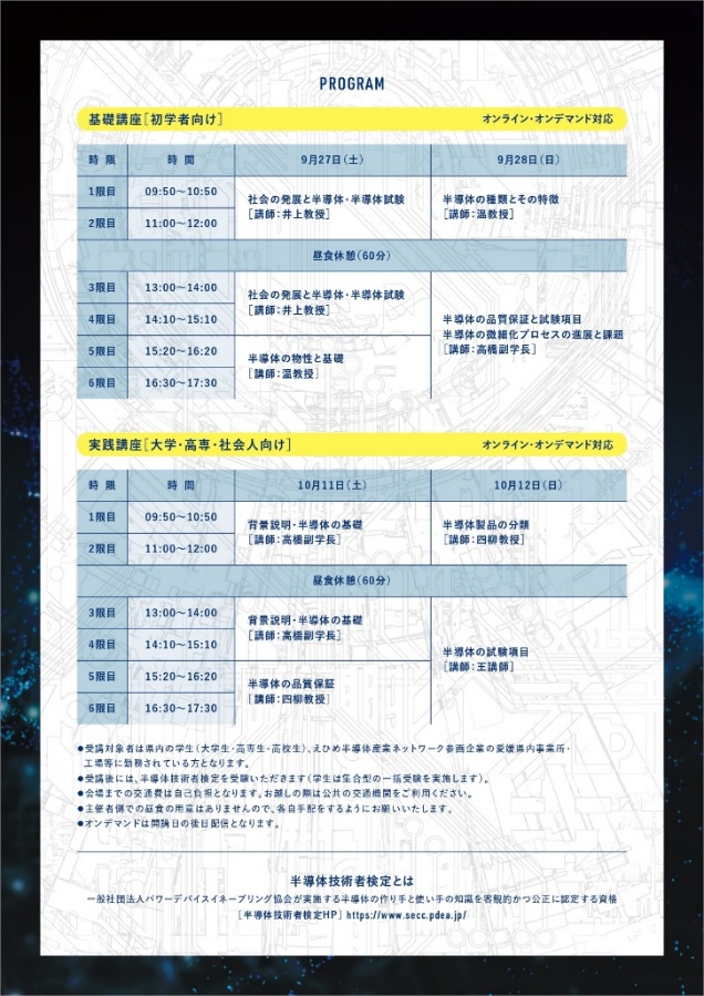 企業、教育機関及び県で構成するえひめ半導体産業ネットワークでは、半導体人材の育成・確保を通じて、本県経済に新たな活力を創出する企業の呼び込みや県内企業の競争力強化を加速するため、県内学生(大学・高専・工業高校)及び半導体関連企業の社員を対象とした半導体人材育成講座を開講します。※申込受付は終了